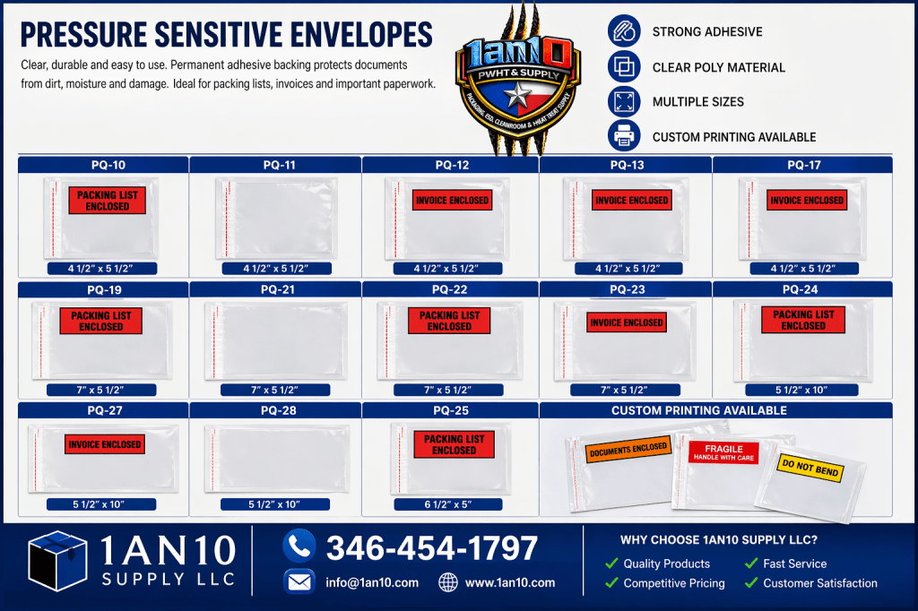 Keep your shipping documents secure, visible, and protected with our Pressure Sensitive Envelopes. Designed for fast application and strong adhesion, these envelopes stick firmly to cartons, pallets, and packages—ensuring important paperwork stays in place from warehouse to final delivery.